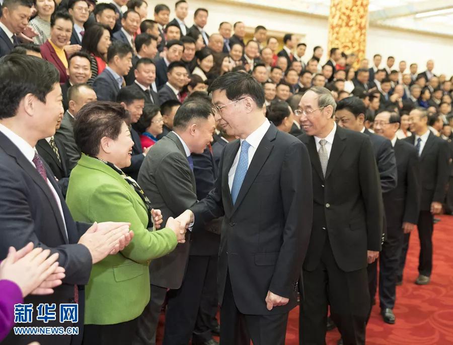 18日上午9时30分,王沪宁来到人民大会堂金色大厅,同代表们亲切握手,并合影留念。