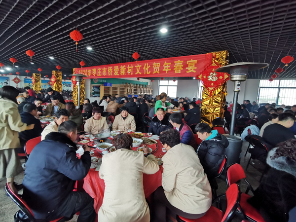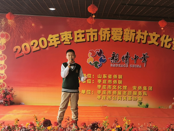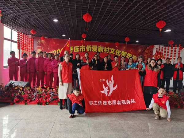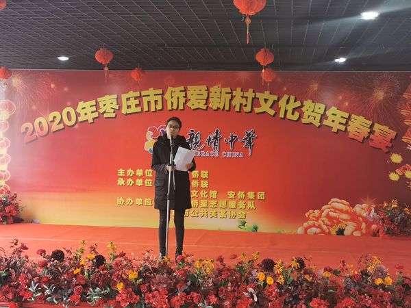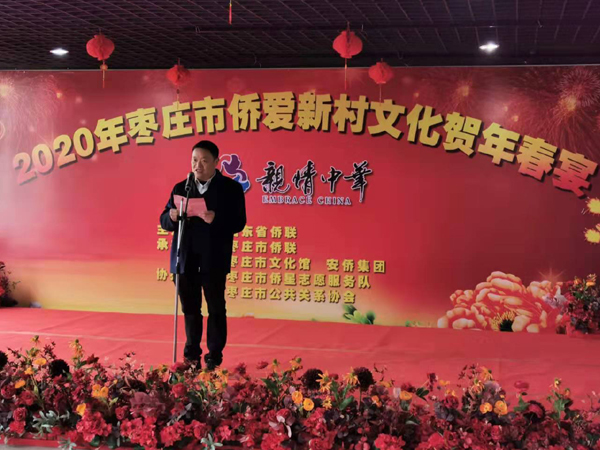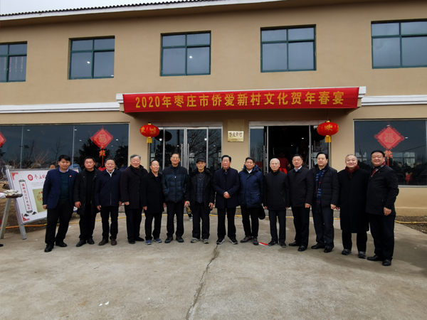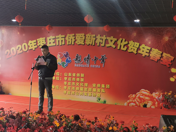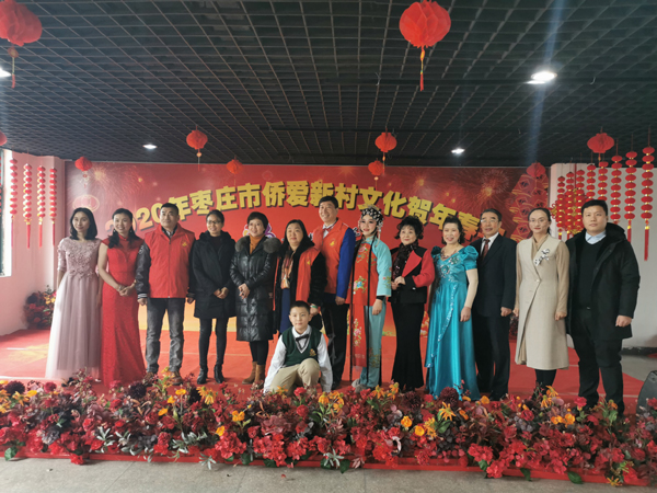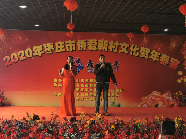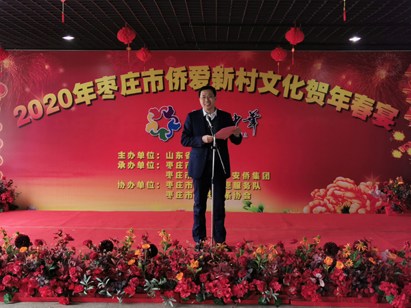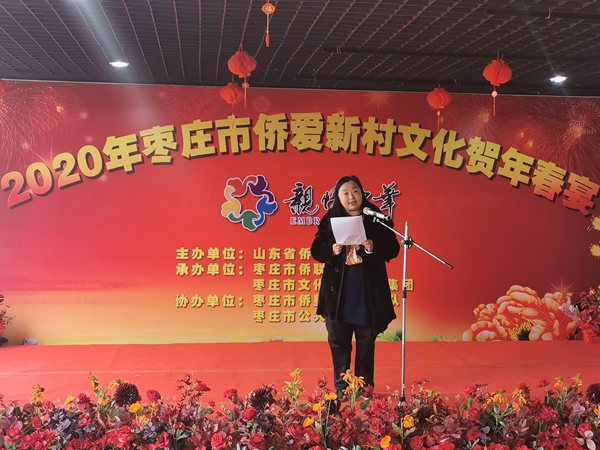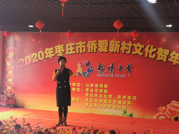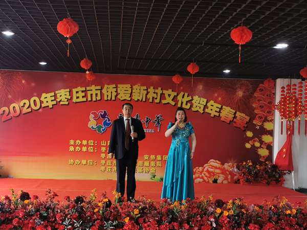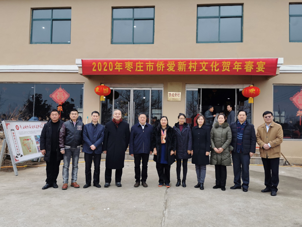 1月22日,新春来临之际,由山东省侨联主办,枣庄市侨联、市文化馆、安侨集团承办,枣庄市侨星志愿者服务队、枣庄市国际公共关系协会协办的2020年枣庄市“侨爱新村”文化贺年春宴在薛城区邹坞镇杭庄“侨爱新村”成功举办。中国侨联常委、中国侨商会副会长、山东省政协常委、省工商联副主席、省侨联青委会会长、侨星志愿者服务团团长刘爱丽走进杭庄看望村民,并向大家送上新春祝福。枣庄市退休老领导孙兰昌、李守义、李华中、庄隆玉、张胜来应邀出席。活动由薛城区委常委、宣传部长翁增光主持,枣庄市侨联主席王玉如,市委统战部四级调研员毕玉英、市侨联副主席赵晖、赵沂明,薛城区政协副主席、区工商联主席姚磊等领导及安侨集团董事长安全平、枣庄市侨星志愿者、枣庄市公共关系协会代表及村民近500人参加活动。
